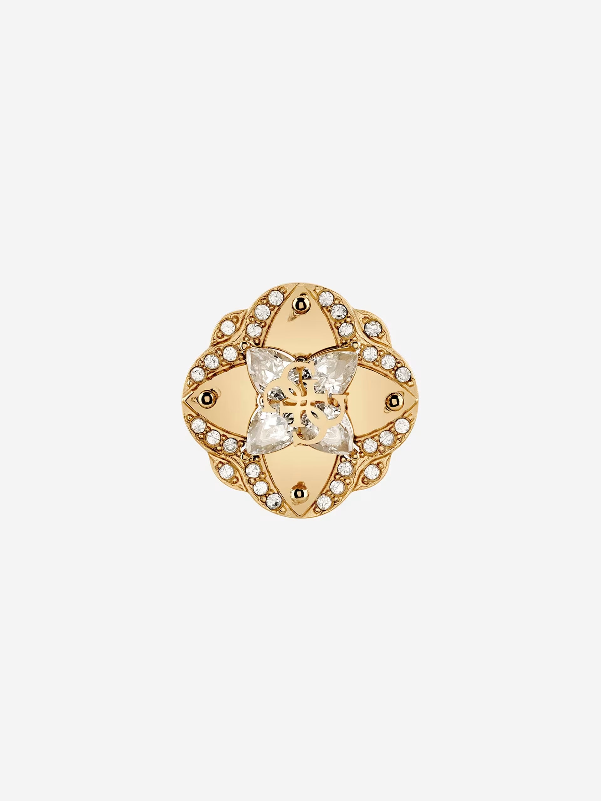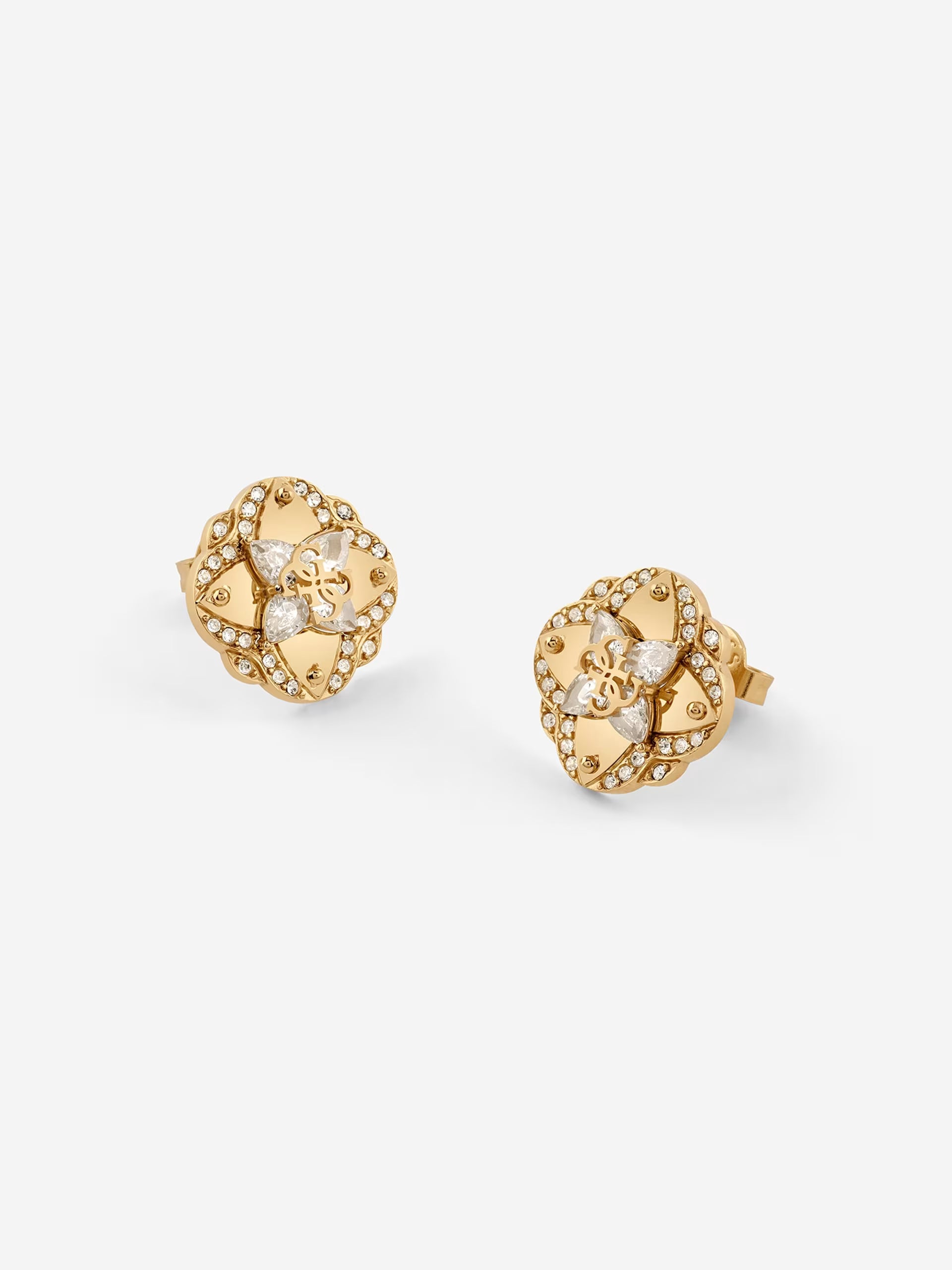Orecchini in acciaio inossidabile. Modello a bottone con motivo a fiore e dettaglio logo 4G.